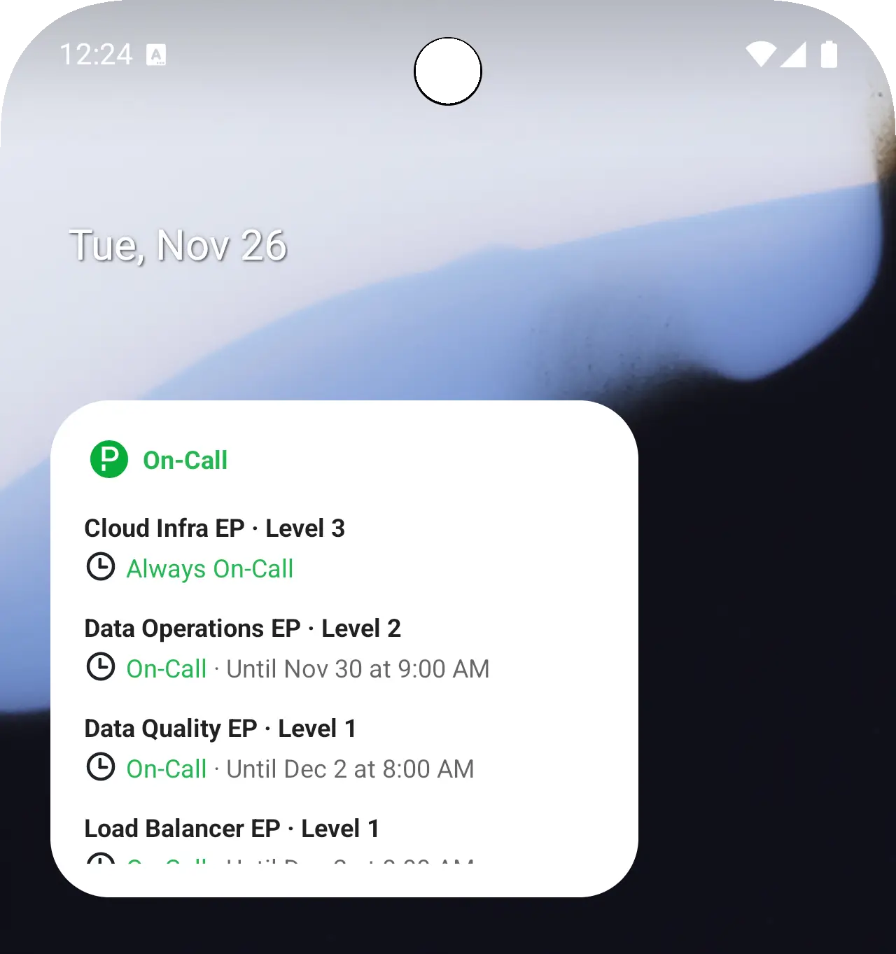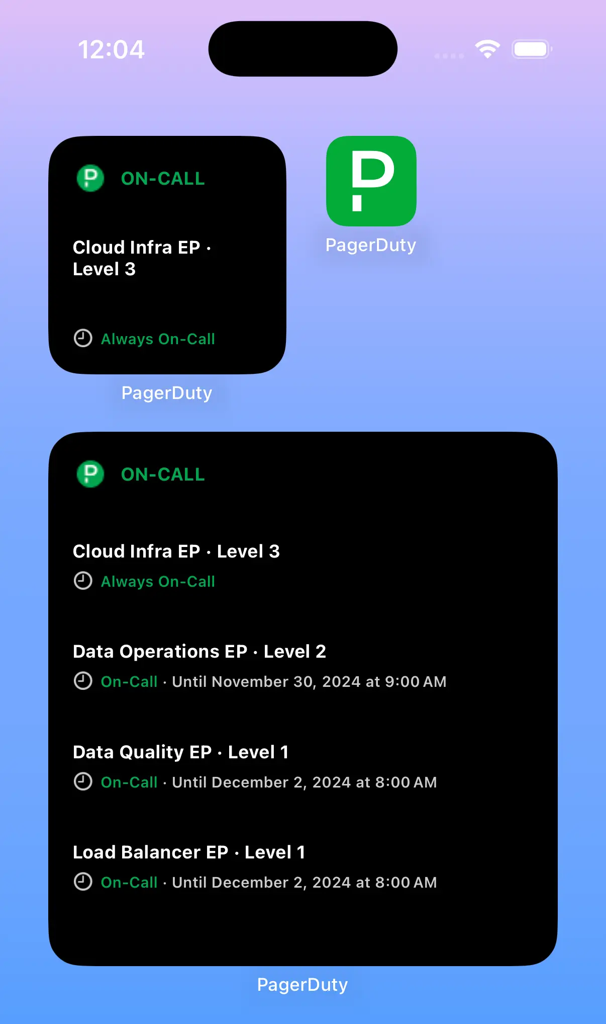 The PagerDuty on-call widget allows PagerDuty Mobile App users to quickly view their on-call status and any upcoming shifts from their device's home screen without needing to open the app.
