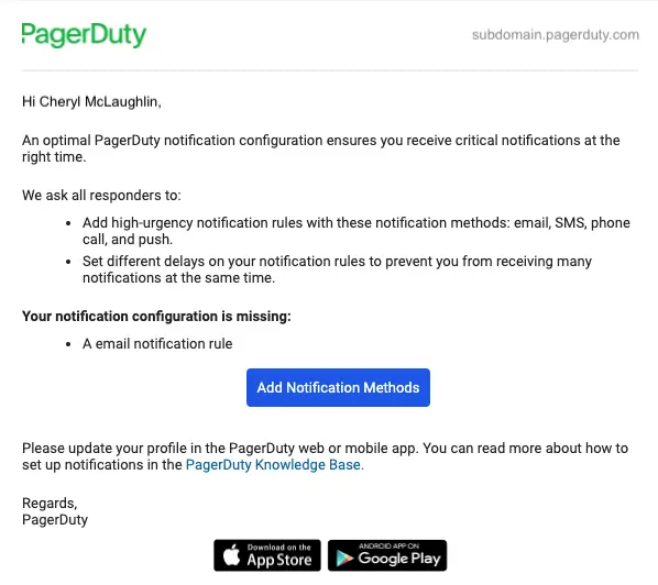 When a Team Manager or Admin sends out emails from the On-Call Readiness Report, the users from the selected Teams that do not meet the report’s criteria will receive emails similar to the below, prompting them to configure their notification rules properly: