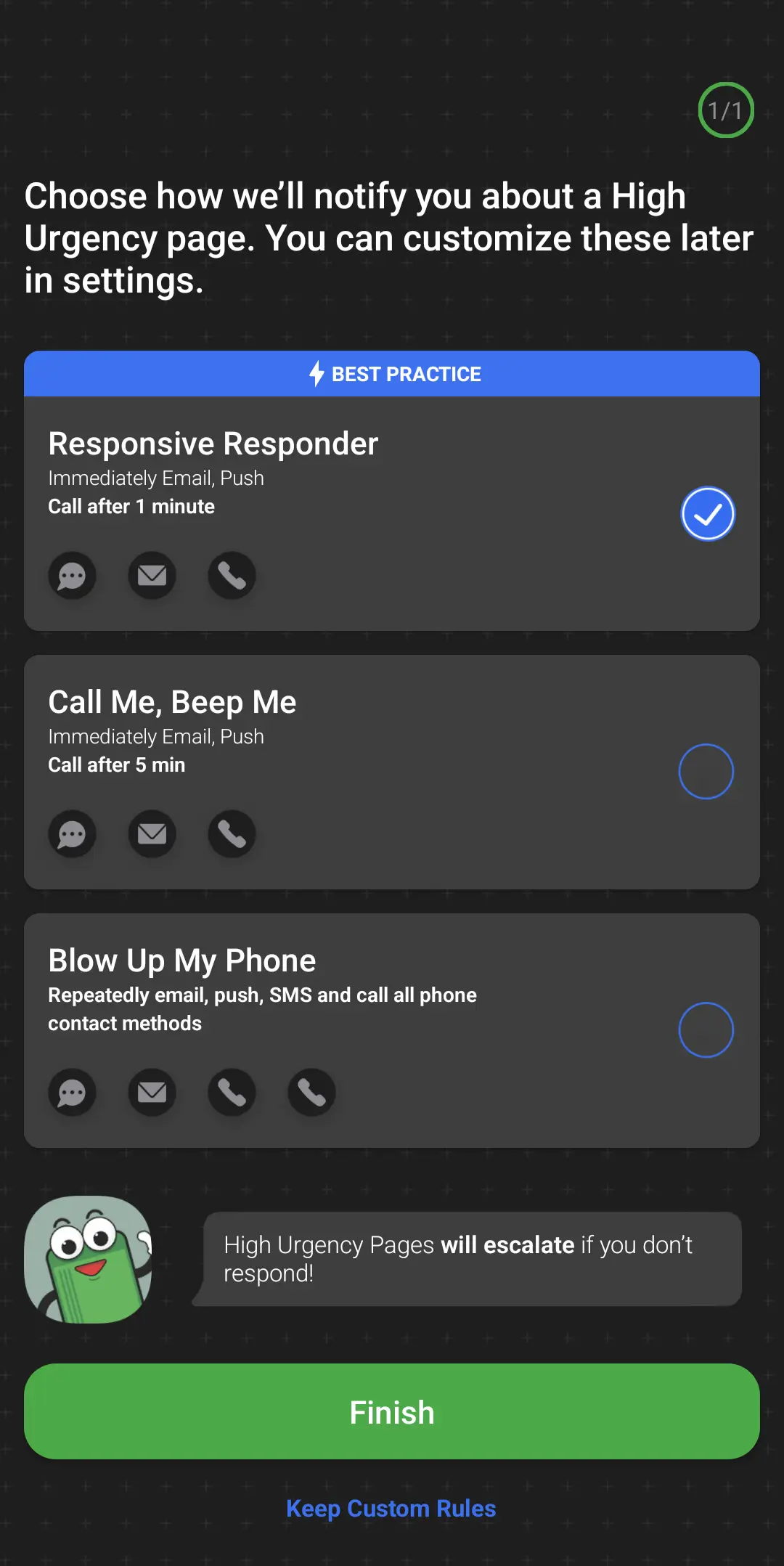 Users that download the PagerDuty Mobile App for the first time will go through an onboarding wizard, which includes fast and easy notification rule setup using our on-call readiness notification rule templates.