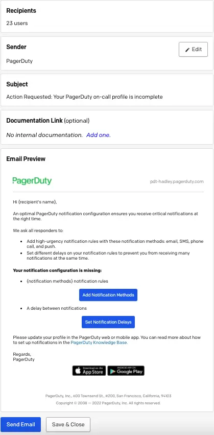 Action Requested: Your PagerDuty on-call profile is incomplete. - Documentation Link (optional): By default the email will direct users to follow documentation in the PagerDuty Knowledge Base. If you wish to link to internal documentation instead, you can do so by clicking Add one, entering a link to your preferred documentation, and clicking Save changes.
