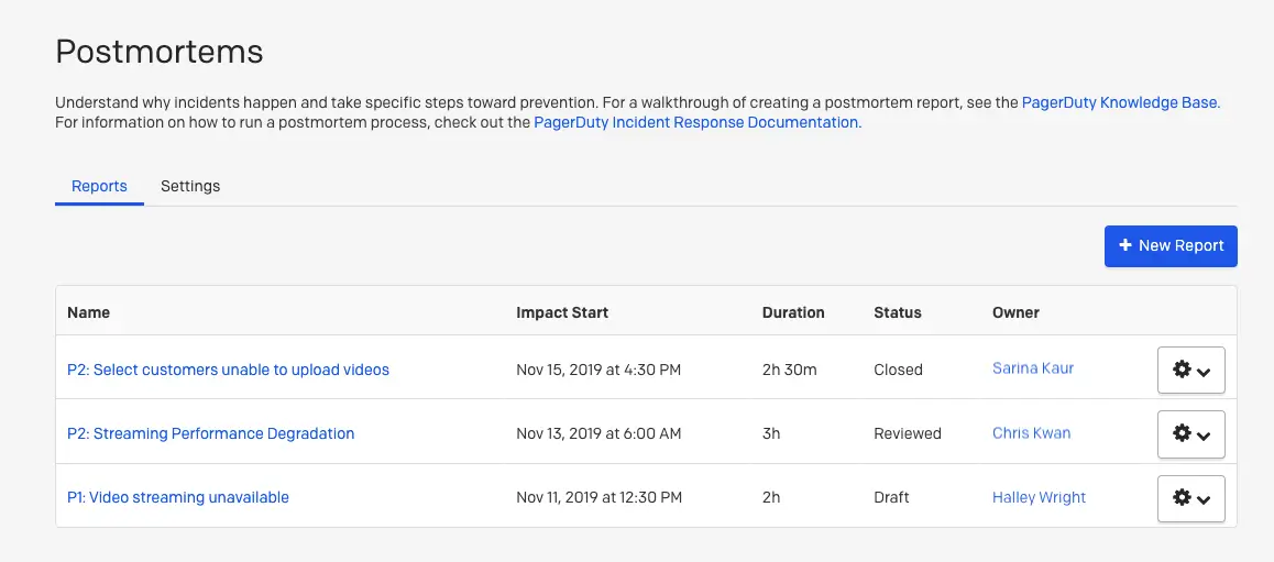 Select Post-Incident Reviews in the Jeli web app to see a list of Post-Incident Reviews. Click an Post-Incident Review's name to see its detailed overview.