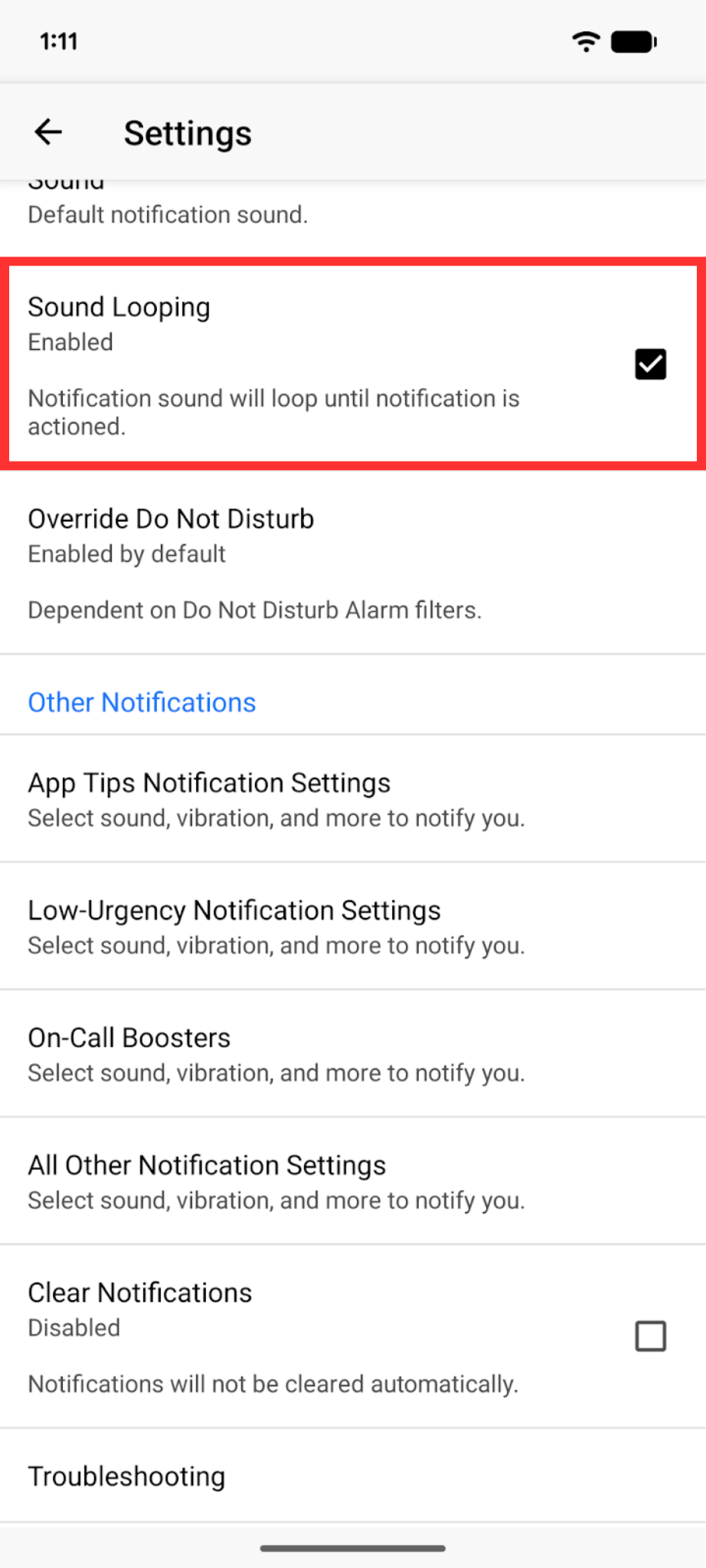 Sound Looping allows the notification sound to loop until the notification is actioned. If disabled, the notification sound will play once and the alarm volume will be reset after a short period of time.
