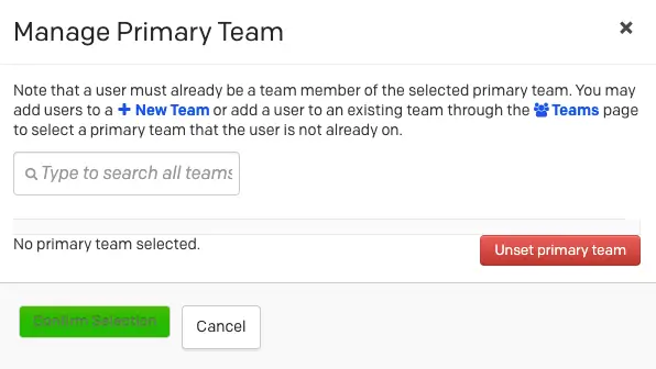 - On the modal that appears, search and select a primary team for the user. You may also remove the primary Team by clicking .