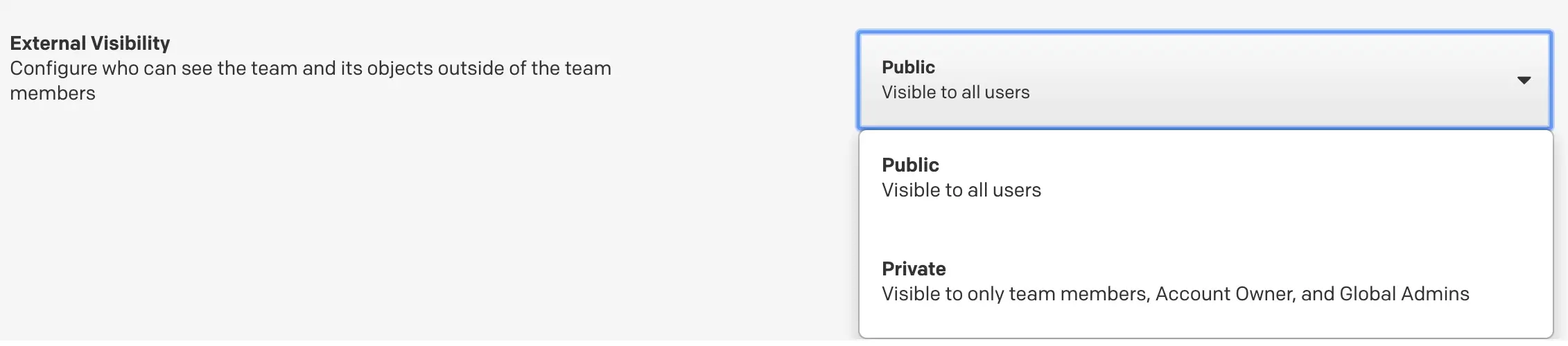 - Private: Teams cannot be viewed and accessed by users outside of those Teams, except for users with Global Admin or Account Owner base roles. Global Admins and the Account Owner have access to all private Teams.