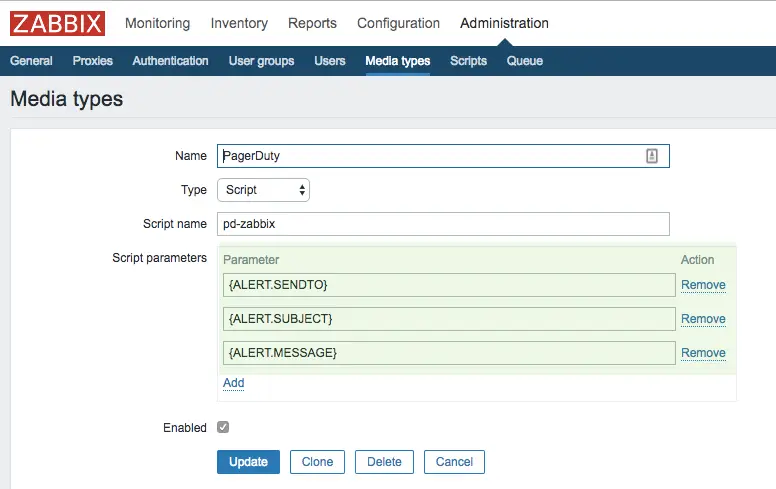- If you're using Zabbix 3.x, make sure you have specified these script parameters for the PagerDuty media type under Administration Media types: