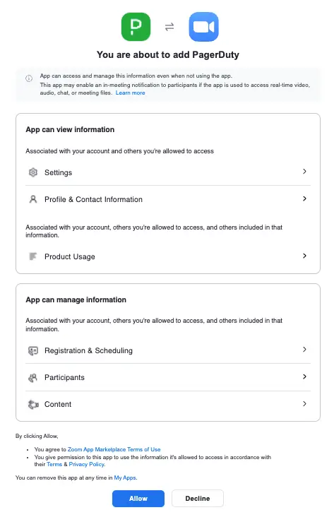 - Navigate to the Zoom App Marketplace and install the PagerDuty app.
