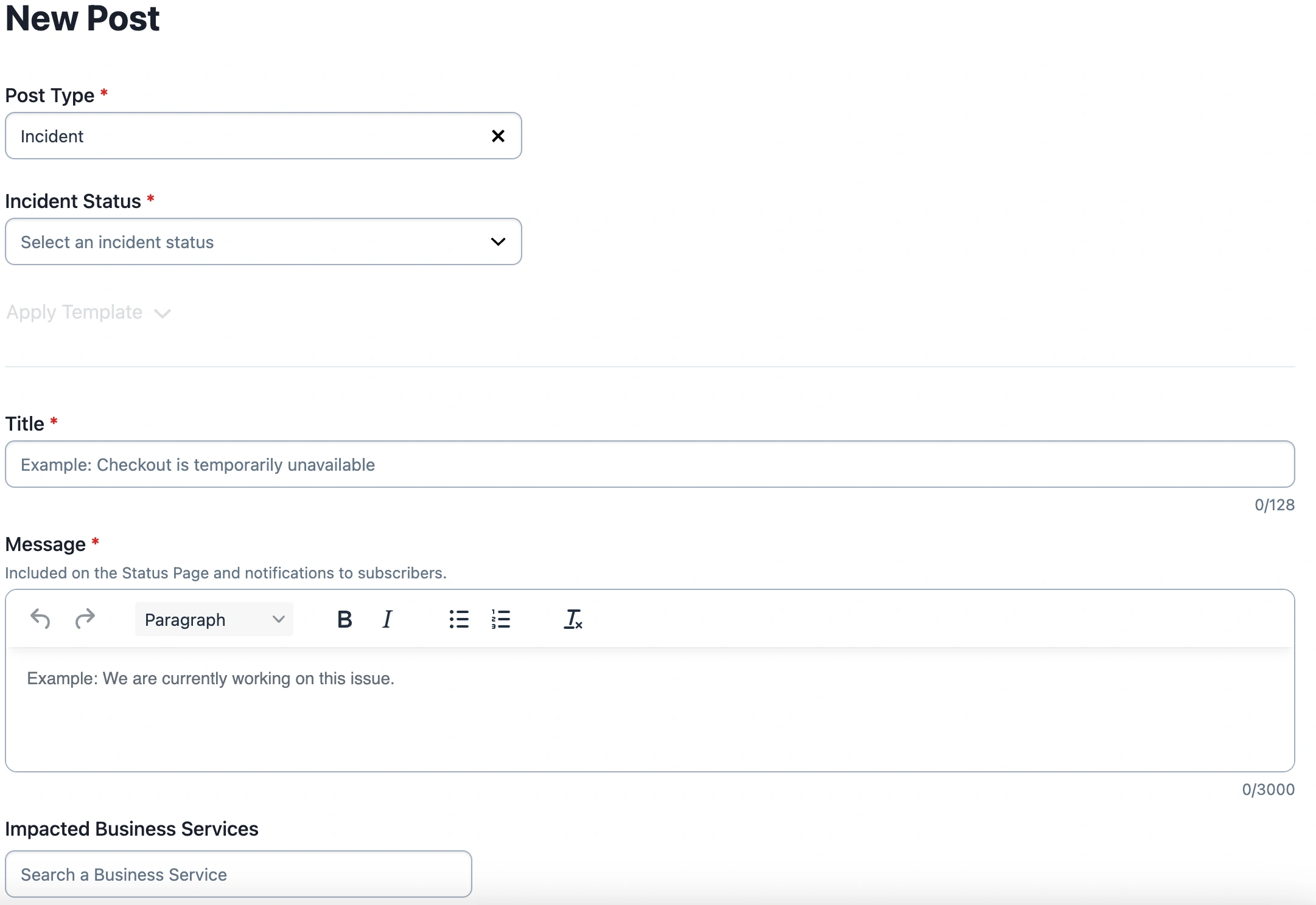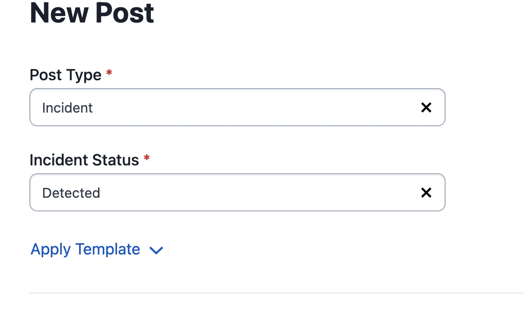 Apply a status page template to populate a post with preset values. Templates can be used with new posts and post updates.