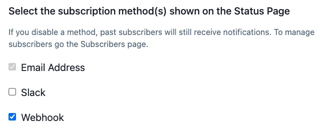 Under Select the subscription method(s) shown on the Status Page, select Webhook .