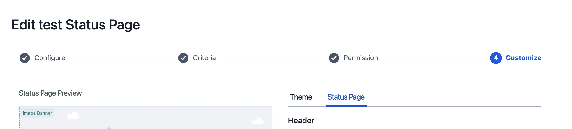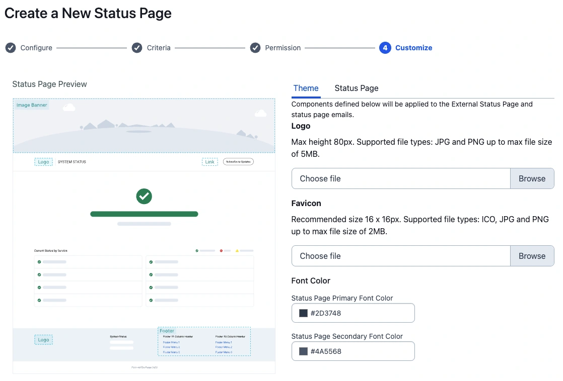 In the Status Page tab, you can optionally add an image to the header and footer, set up a navigation bar, and you can include relevant links to your status page.