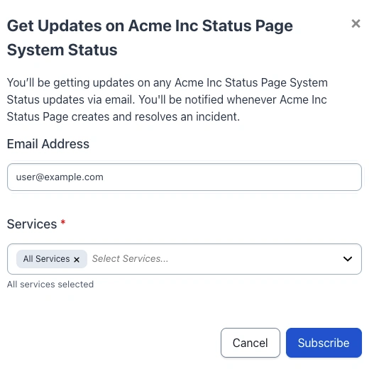 In your web browser, navigate to the status page's public URL and click Subscribe to Updates in the top-right.