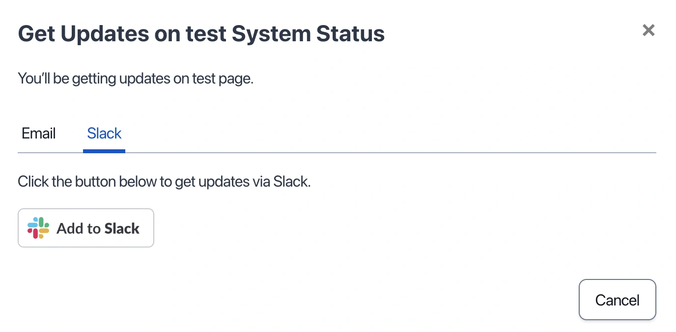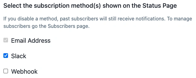 Under Select the subscription method(s) shown on the Status Page, select Slack .
