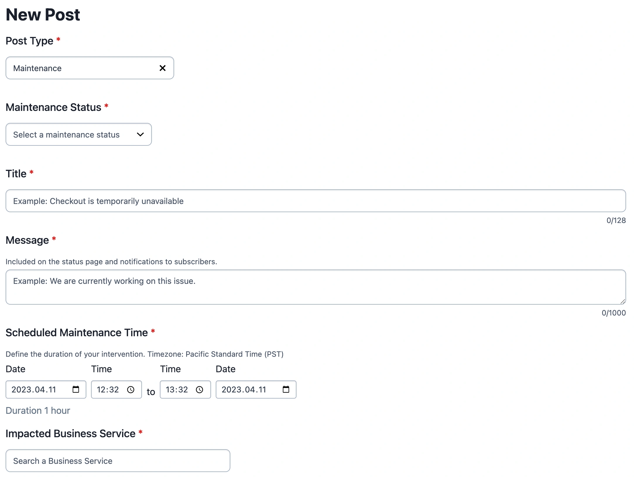 Use status page templates to create preset posts that can be selected during an incident or maintenance.