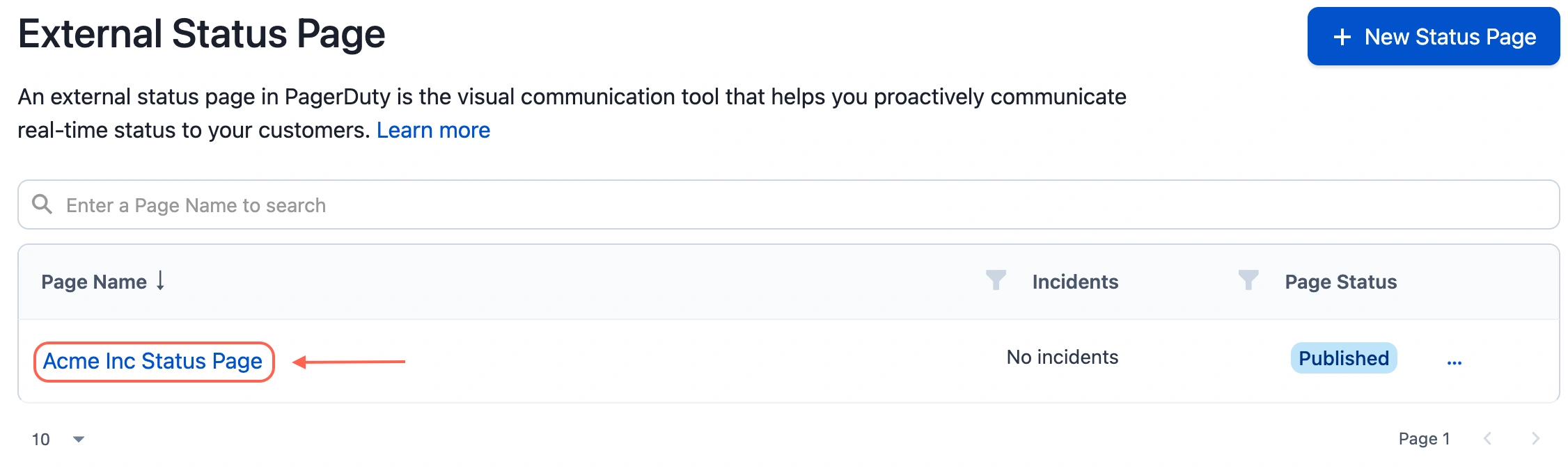 PagerDuty users can view an external status page by navigating to its unique public URL (e.g., https://subdomain.trust.pagerduty.com), or in the PagerDuty web app by navigating to StatusExternal Status Page and selecting a status page's title from the list.