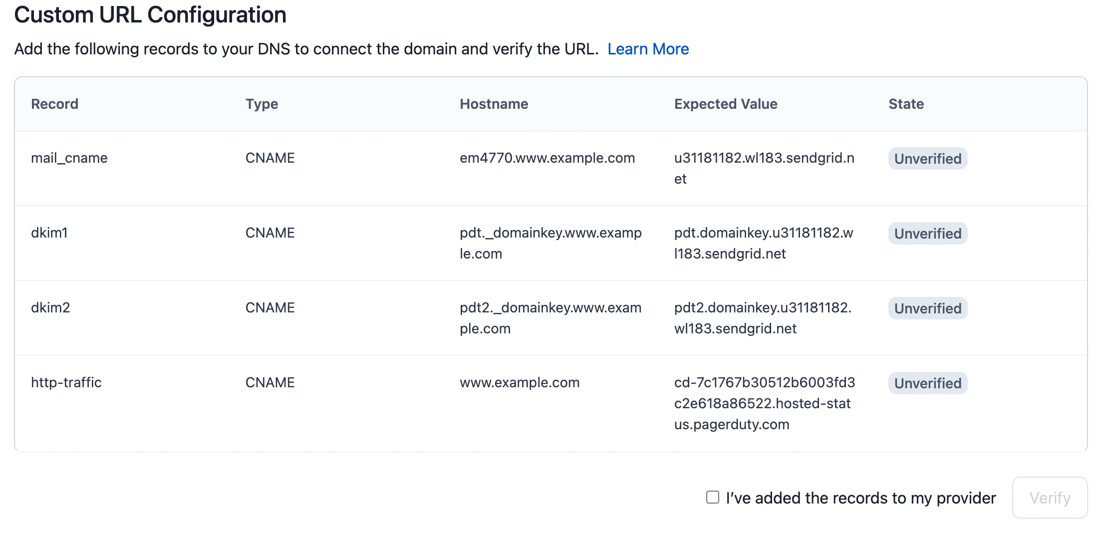 After you publish an external status page, you can configure a Custom URL, which will be used for the sender address when email notifications are sent to status page subscribers. PagerDuty will generate a set of DNS records, each of which must be verified with your DNS provider.