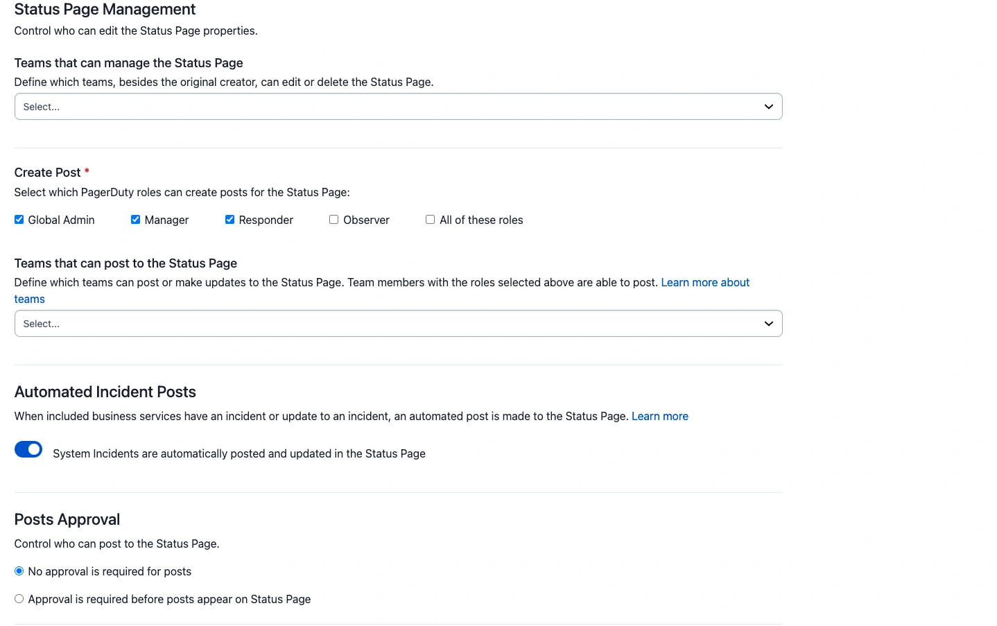 Select which PagerDuty roles can create posts for the External Status Page: Global Admin, Manager, Responder, Observer and/or All of these roles.