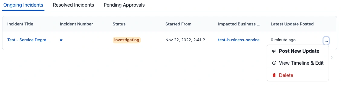 Post Update: Select the menu to the right of your preferred incident and select Post Update. On the next screen, click Apply Template and then select your preferred template from the dropdown. Your template will automatically apply to all of its preset fields. You may make edits after applying the template, or you can leave it as is. Click Update to post your update.
