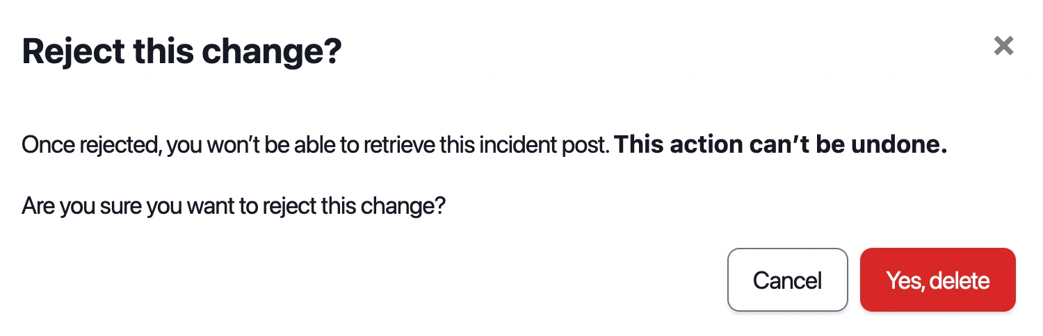 Delete: A modal will appear to let you know that this action cannot be undone once deleted. If you wish to proceed, click Yes, delete.