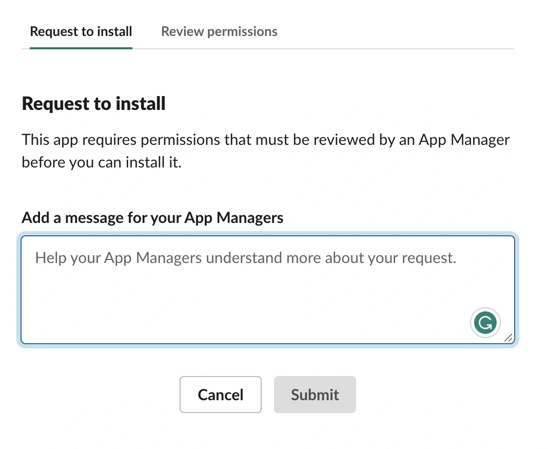 If you have administrative permissions to add apps to your Slack workspace, select a channel from the dropdown and click Allow to authorize your workspace. If you do not have administrative permissions, you can add a message for your App Managers and click Submit to send the installation request to your organization's Slack admins.