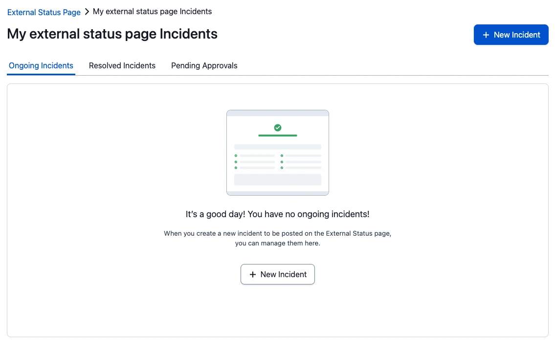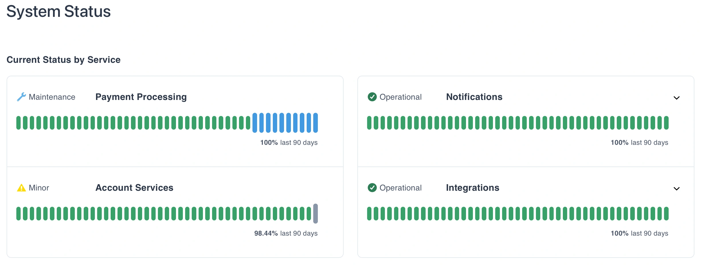 External Status Pages offer public audiences a unified source of truth about your infrastructure’s health. You can customize this feature to fit your brand’s look and feel, and define different views and sets of Business Services to display. Visitors can stay informed about ongoing incidents and read status updates, or subscribe to your status page to receive notifications via email, Slack, or webhook.