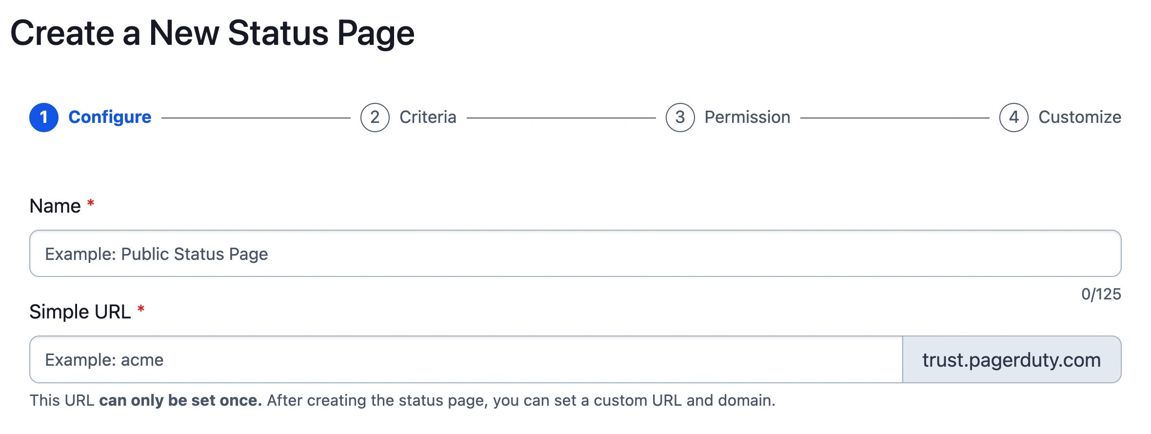 Enter a descriptive Name for your status page. In the Simple URL field, create a unique public subdomain that your users can access.