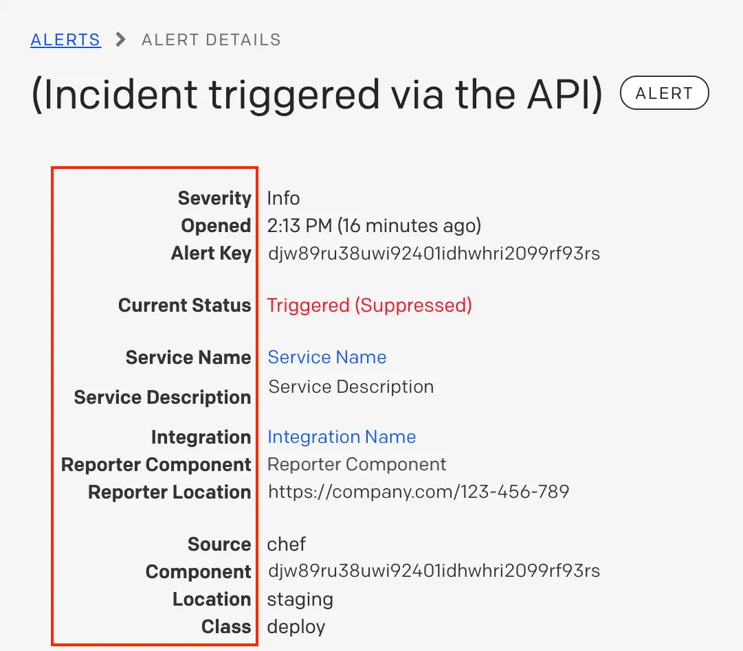 PD-CEF details display at the top of alert and incident detail pages. They express common event concepts in a normalized, readable way.